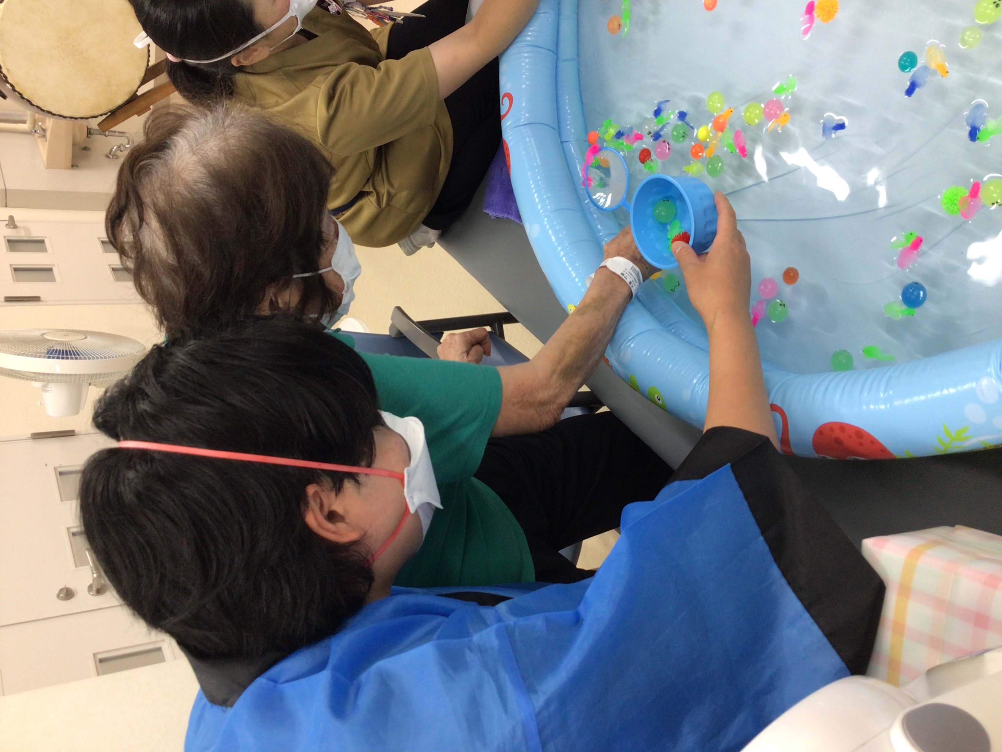 夏祭りでは、1人1人はっぴを着て「射的」「スーパーボールすくい」「風船バレー」を行いました。患者様は「はっぴを着ると祭りって感じがする」「とても楽しかったです」と笑顔でお話しされていました。参加された患者様には、わたがしと当日撮影した記念写真をお渡ししました。普段リハビリでは見ることが出来ないような真剣な表情や笑顔を見ることができ、とても素敵な時間となりました。